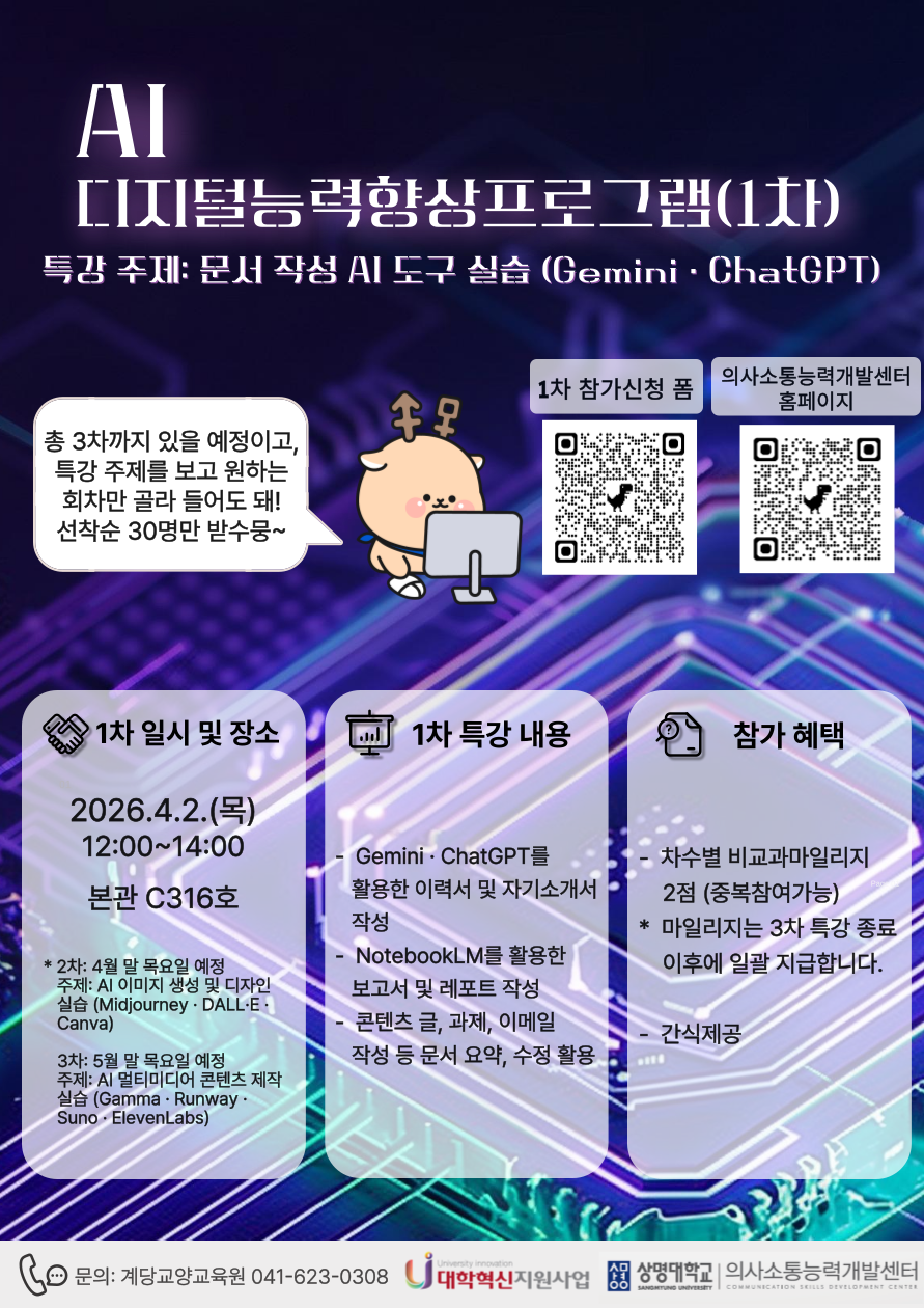 천안 [비교과] [의사소통능력개발센터(천안)] 2026-1 AI 디지털능력향상프로그램(2차) 참여자 모집